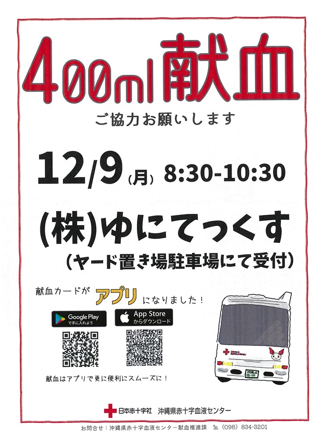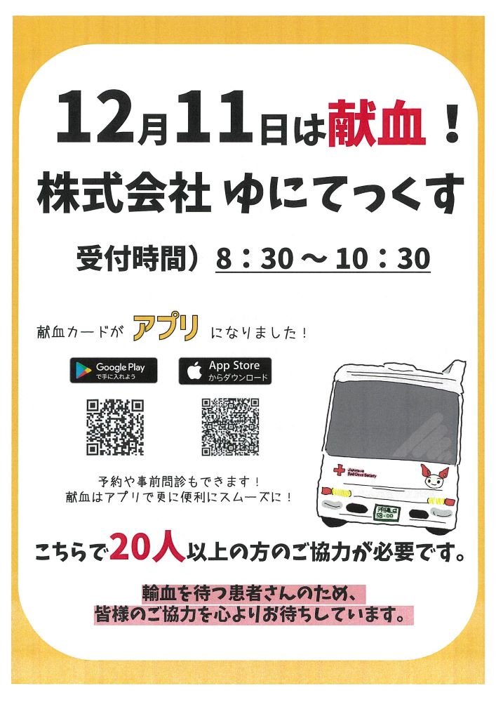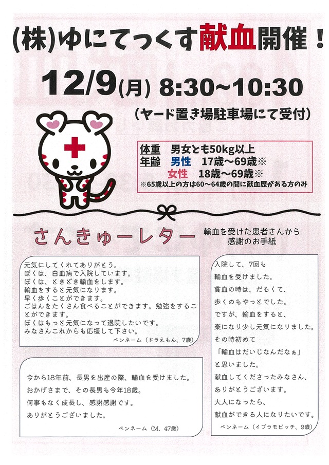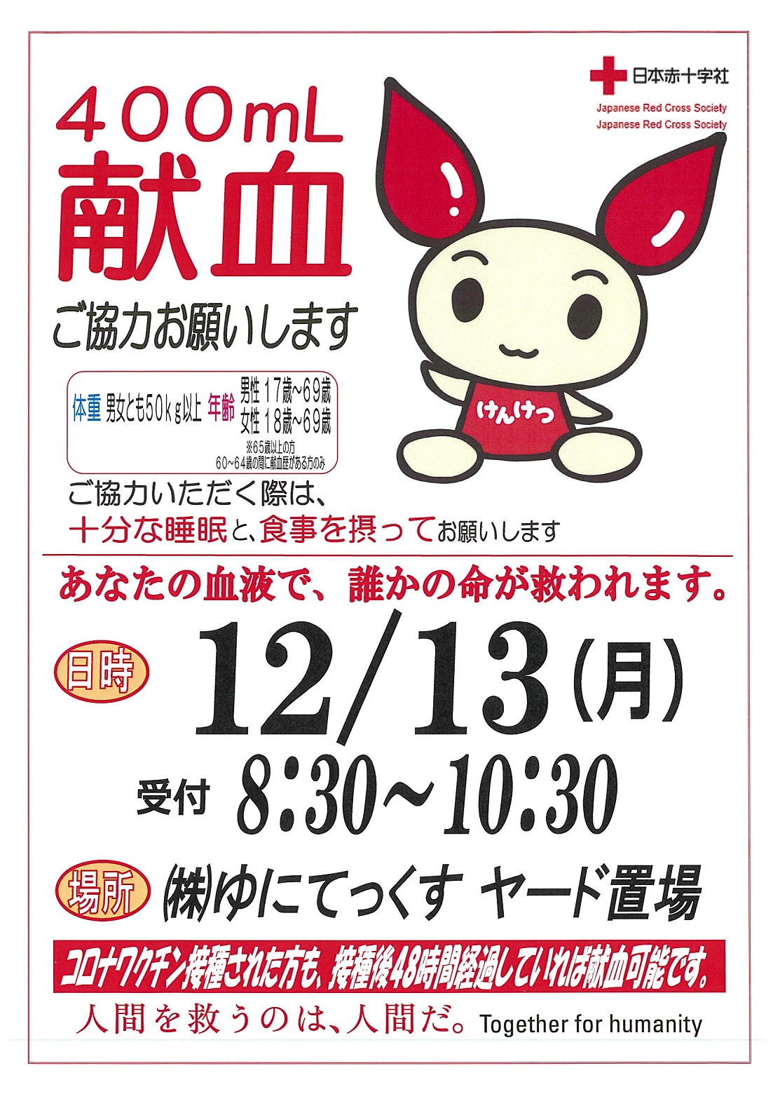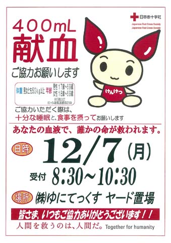 今年最後の献血を12月9日(月)8:30~10:30ゆにてっくす(ヤード)で行います。