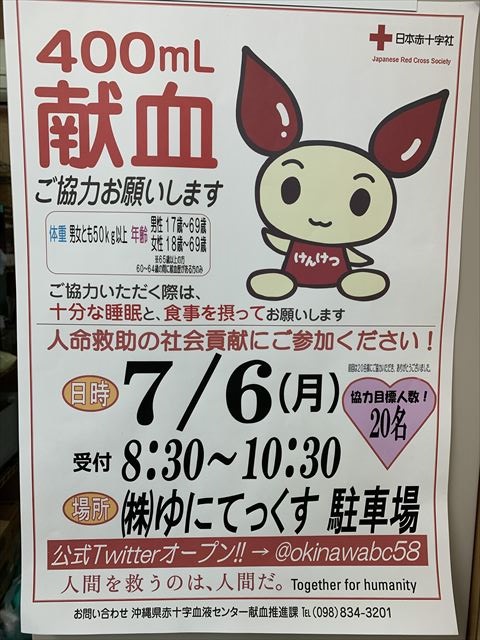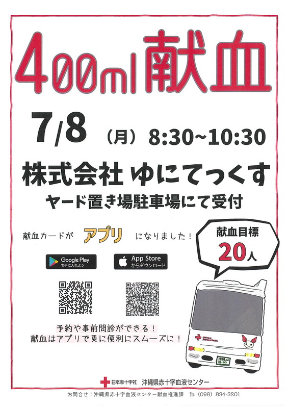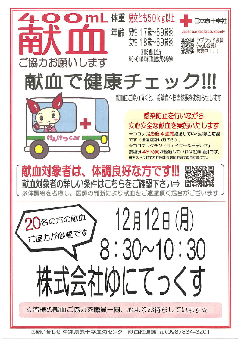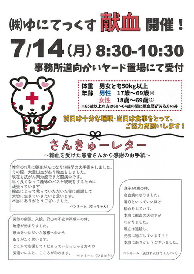ゆにてっくすでは年2回7月と12月の第一or第二月曜日に献血を行っております。