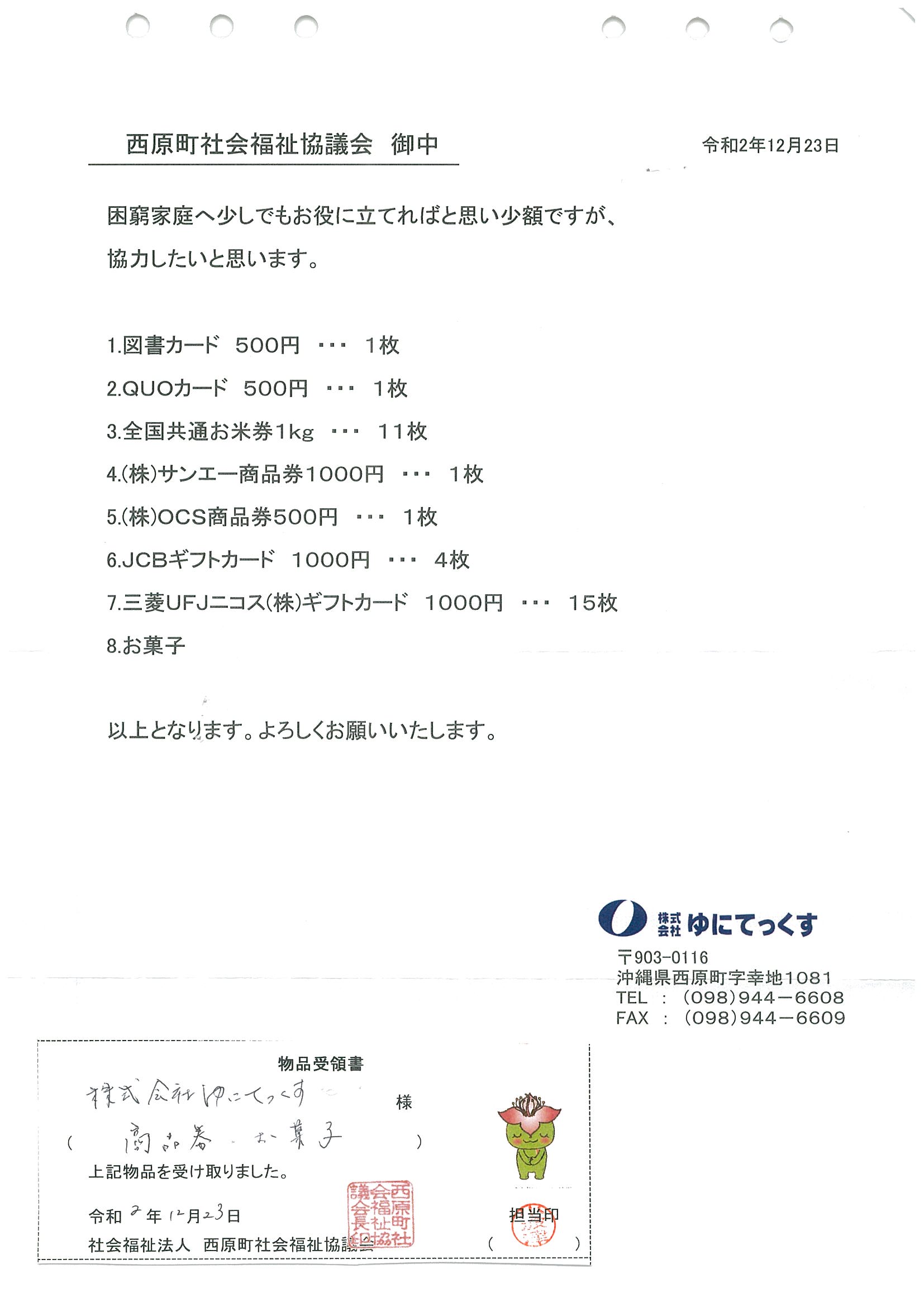 西原町社会福祉協議会へ、少額ですが商品券を寄付しました。