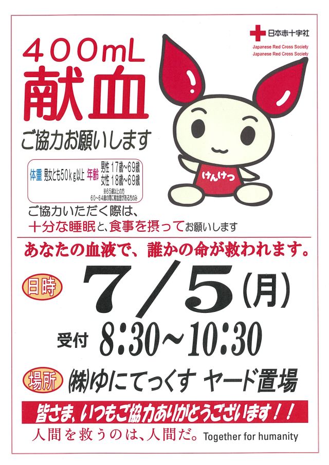 ゆにてっくすでは年2回7月と12月の第一月曜日に献血を行っております。