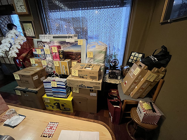 野の花にて忘年会。ゲームや景品もたくさんありました。