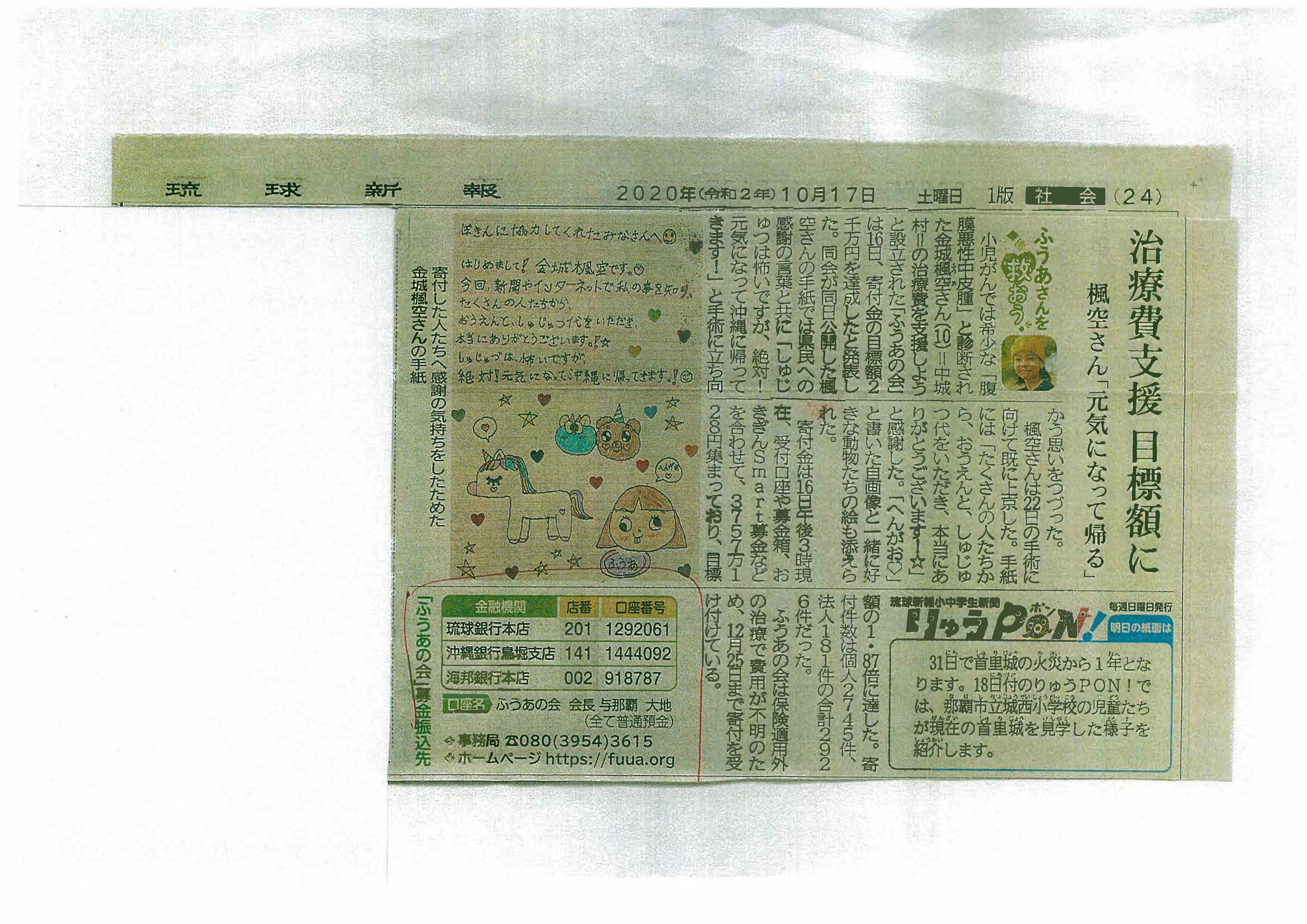 小児がんと闘う金城楓亜さんへ、少しでも力になれればと『ふうあの会』へ、ゆにてっくす共済会より5万円寄付しました。